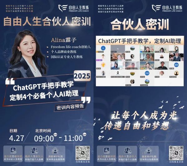 一种人会拼尽全力去搜集信息、做足准备,希望等到“万无一失”的那一刻再出发。他们很努力,甚至焦虑地反复确认每一个细节,但越准备,却越觉得自己还不够好、不够稳,于是迟迟不敢跨出真正开始的那一步。而另一种人,则是在面对未知与不确定时,也依然选择了出发。他们或许也会紧张,也没能把一切安排妥当,但他们相信真正的成长不靠等待,而是在行动中不断修正,在真实的挑战中边走边学。在这个四月,【自由人生教练】平台里,许多真实的故事正在悄然发生。没有轰轰烈烈的宣告,只有一群普通人,用实际行动回应内心的召唤。他们没有等到“准备好了”才开始,而是选择了先出发,也因此拥有了属于自己的人生节奏。在过去的一个月里,我们的自由人生合伙人们一直在突破自我,探索新的商业模式与个人品牌的打造。Alina霖子为合伙人们带来了《ChatGPT手把手定制4个个人AI助理》的【自由人生合伙人密训】,帮助大家在AI时代利用科技提高工作效率,让更多的人能够过上“做得更少,赚得更多”的生活。学员们纷纷表示收获满满,AI助理让品牌打造效率倍增!