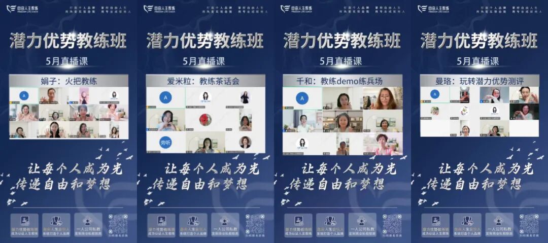 如果你渴望成为一名专业的人生教练,【自由人生潜力优势教练班】无疑是最佳选择。平台将会为你提供基于独创测评系统《潜力优势测评》的全方位教练技术培训,帮助你掌握从教练咨询到市场推广的各项核心技能。5月,我们的4位督导教练带来了精彩的4次直播学习课,带领学员深入实战,稳扎稳打提升教练技术与表达力: - 曼珞教练 主讲《潜力优势测评&商业化分享》,帮助学员理解如何将测评工具真正应用于商业实践中;