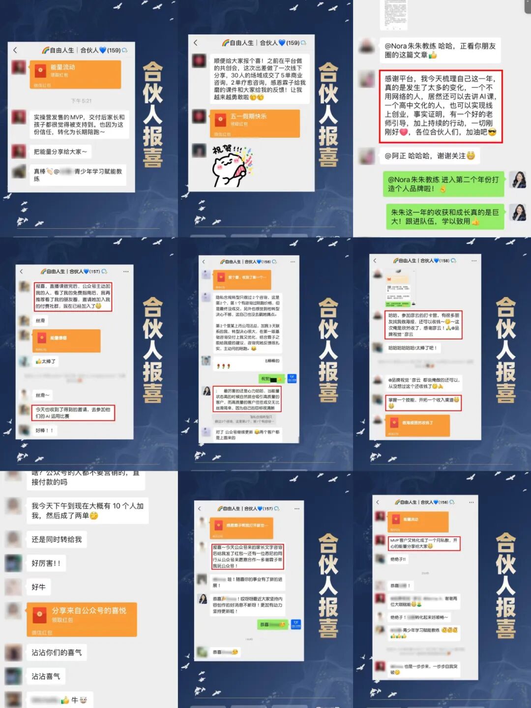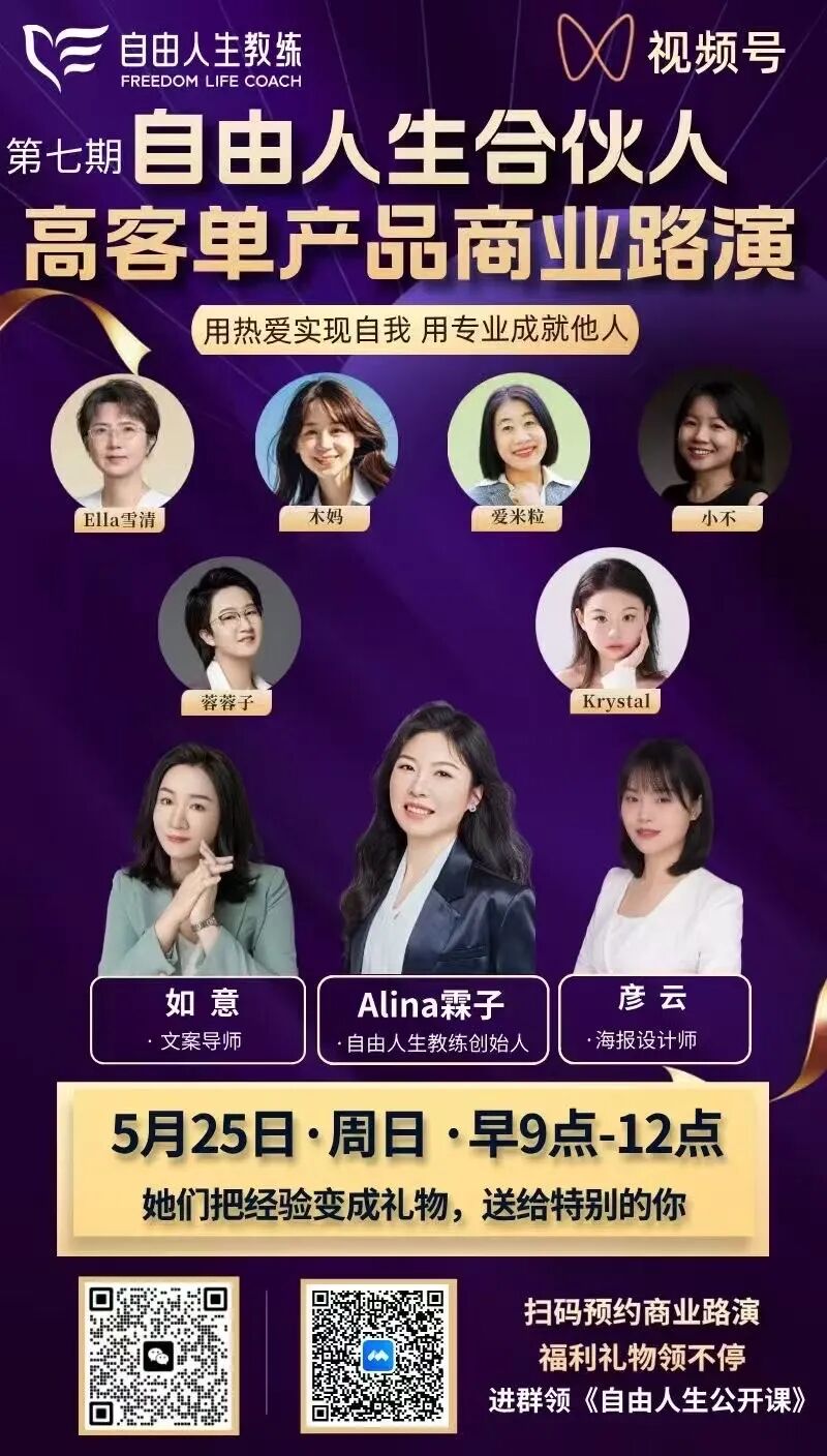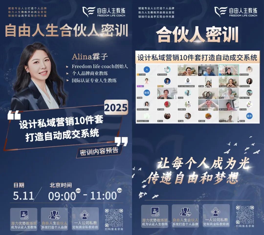 在这个快节奏、焦虑感频繁袭来的时代,“慢”反而成为一种难得的能力——慢下来,才能看清方向;稳起来,才能走得更远。2025年5月,自由人生教练平台以“不慌不忙、稳步成长”为主旋律,在【自由人生合伙人】、【潜力优势教练班】和【自由人生VIP会员】社群都悄然积蓄了一股强劲的内在动能。每一次更新,每一次练习,每一位新成员的加入,都是对“长期主义”的最好注解。在【自由人生教练】,我们始终相信:真正想走得远的人,不会急于求成,而是带着耐心和觉知,一步步夯实基础,构建属于自己的“可复制成果”在5月的【自由人生合伙人密训】中,Alina霖子为大家带来了重磅实战课《设计私域营销10件套,打造自动成交系统》。这不仅是一套营销策略,更是她亲身验证、反复打磨、亲自使用过的私域成交流程。她手把手指导合伙人如何在低粉状态下实现高转化成交,一步步帮助大家建立起属于自己的自动运转的商业闭环系统。5月,我们迎来了多位优质新合伙人加入,他们横跨教育、医疗、技术、品牌文案、安全信息等多个领域,每一位都是在原有职业路径上拥有多年经验,并选择勇敢探索新可能的实践者:5月的另一大亮点是,【第7期高客单产品实操营】的圆满收官。这是一场历时21天的深度训练营,6位自由人生合伙人将多年来积累的专业能力和客户经验,沉淀成了属于自己的第一个高客单知识产品。从结构设计、高客单海报打造,到销售话术与转化路径构建,她们不仅完成了实战落地,还迎来了人生中第一次正式的商业路演。值得一提的是,本期参与实操营的合伙人,普遍都是已有一定影响力、服务经验丰富的教练与咨询师。高客单产品的打造,对主理人的思维成熟度、产品承载力和客户理解力要求极高。如果没有前期的长期积累与稳定输出,就无法真正打通“高客单转化链路”。这也正是【自由人生教练】内容体系的精妙所在:它让合伙人们看见了一条从零到高客单的清晰升级路径—— 在【个人品牌实操营】中完成MVP产品发布,积累第一批种子客户; 最终在【高客单实操营】中打磨核心产品,建立高价值商业闭环。比如,自由人生合伙人&青少年学习力教练议敏,就在完成MVP产品发售后,成功转化出多位高客单私教客户。她的案例,也让越来越多学员看到了不靠运气、不靠流量、靠系统、靠实操也能升单变现的现实路径。【自由人生潜力优势教练班】