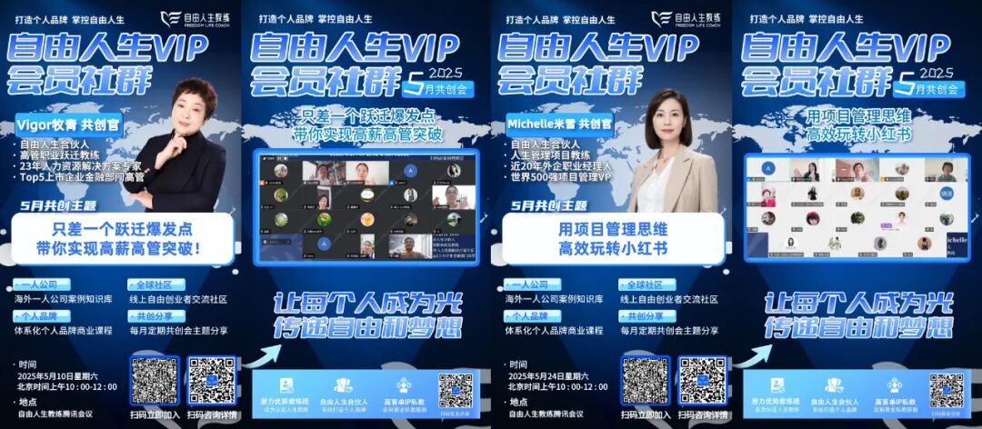 【自由人生VIP会员】社群内,行业大咖分享最前沿的经验, 我们关注的不只是“变现速度”,更关注底层认知和实操系统的建设:- 高管跃迁教练 牧青 带来《只差一个跃迁爆发点,带你实现高薪高管突破!》,引导大家洞察职场瓶颈,找到跃迁路径。