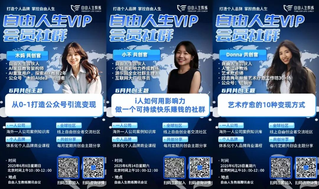 【自由人生VIP会员】社群内,行业大咖分享最前沿的经验, 我们关注的不只是“变现速度”,更关注底层认知和实操系统的建设:- AI家庭教育架构师木妈带来《从0-1打造公众号实现引流变现》,拆解她从起号到变现的完整链路;