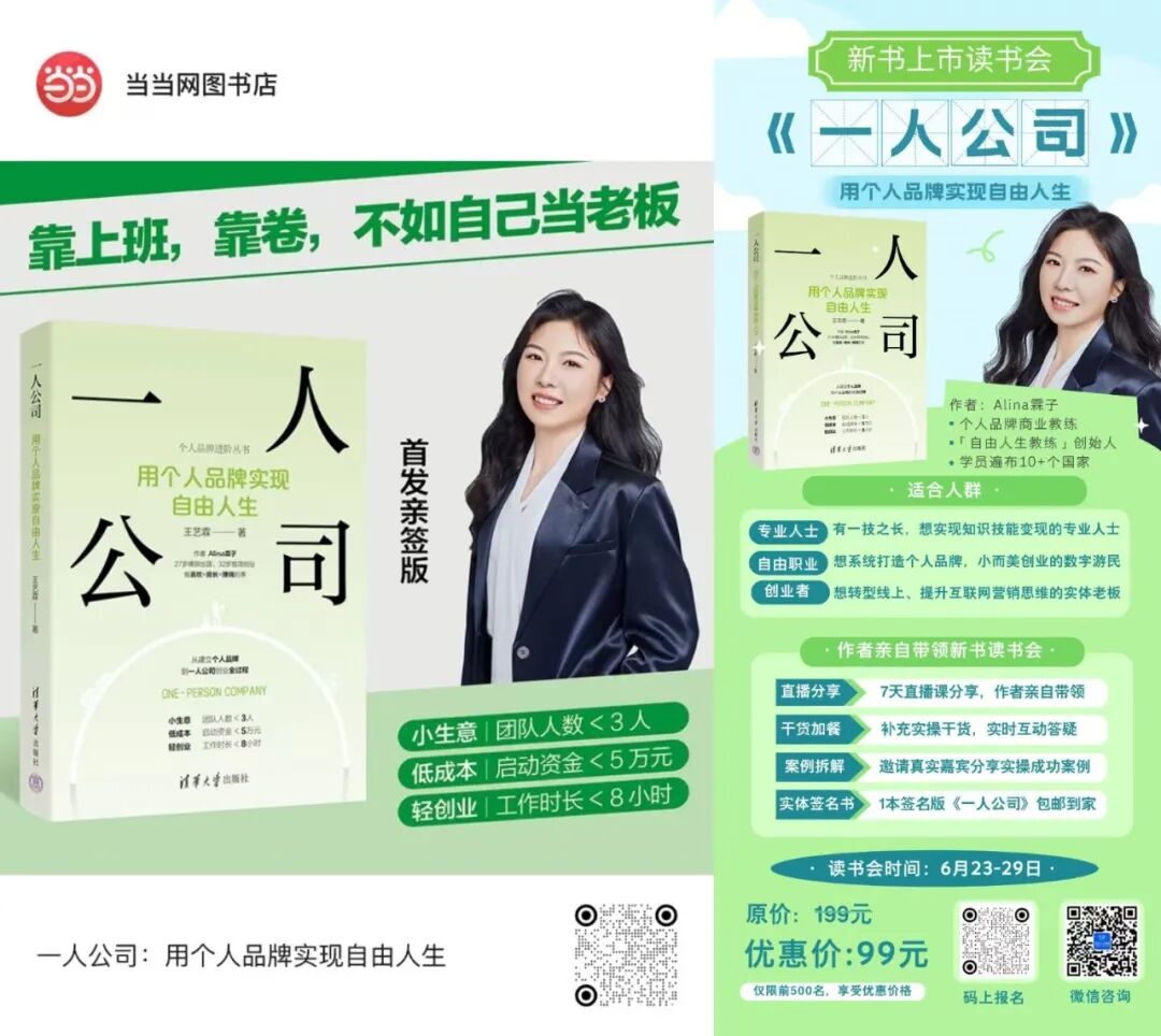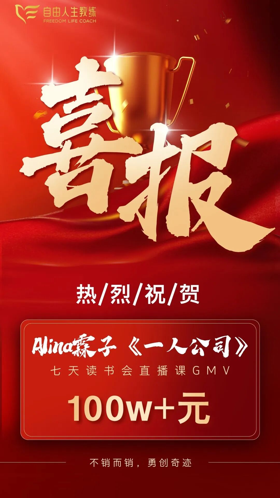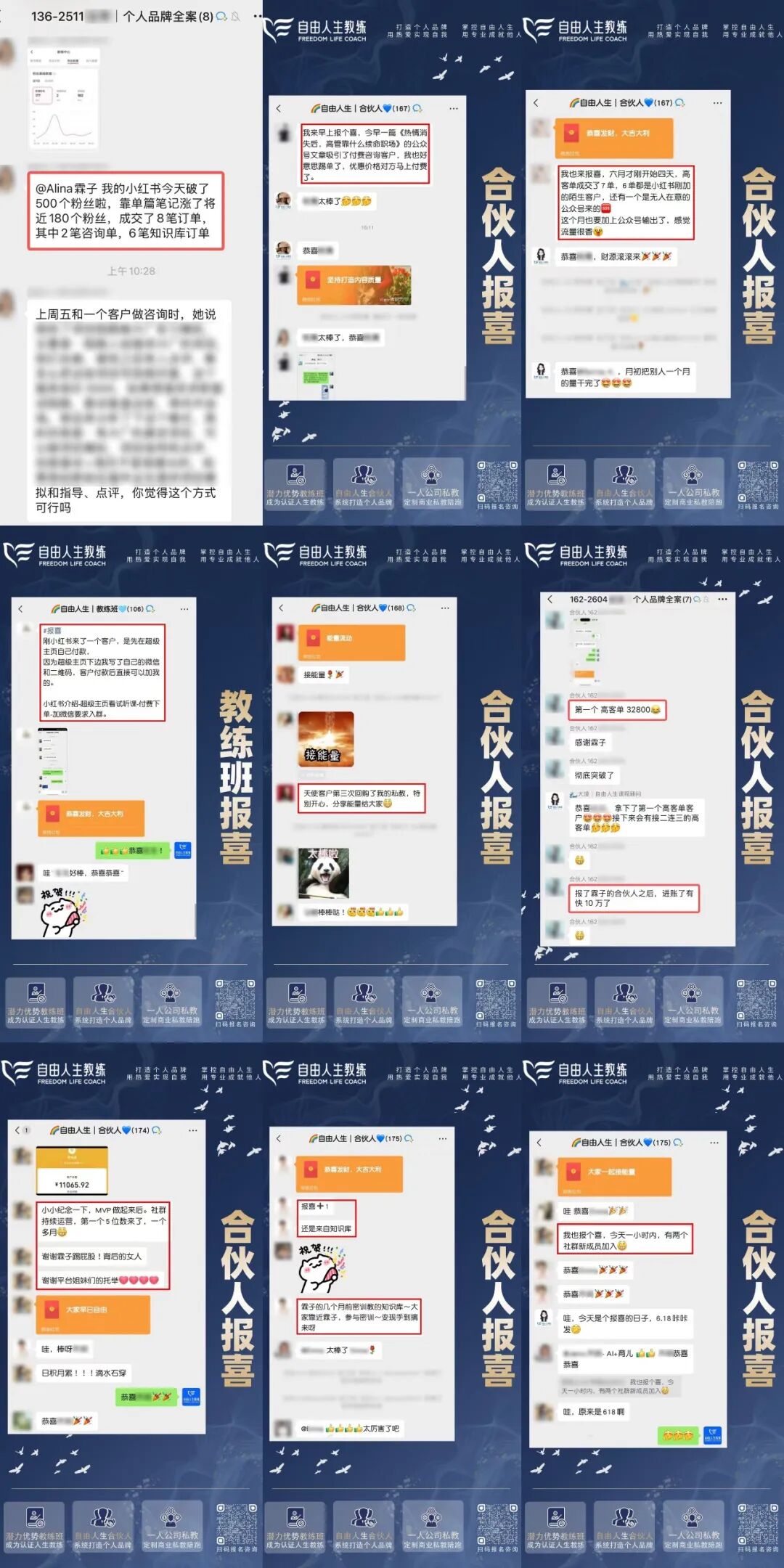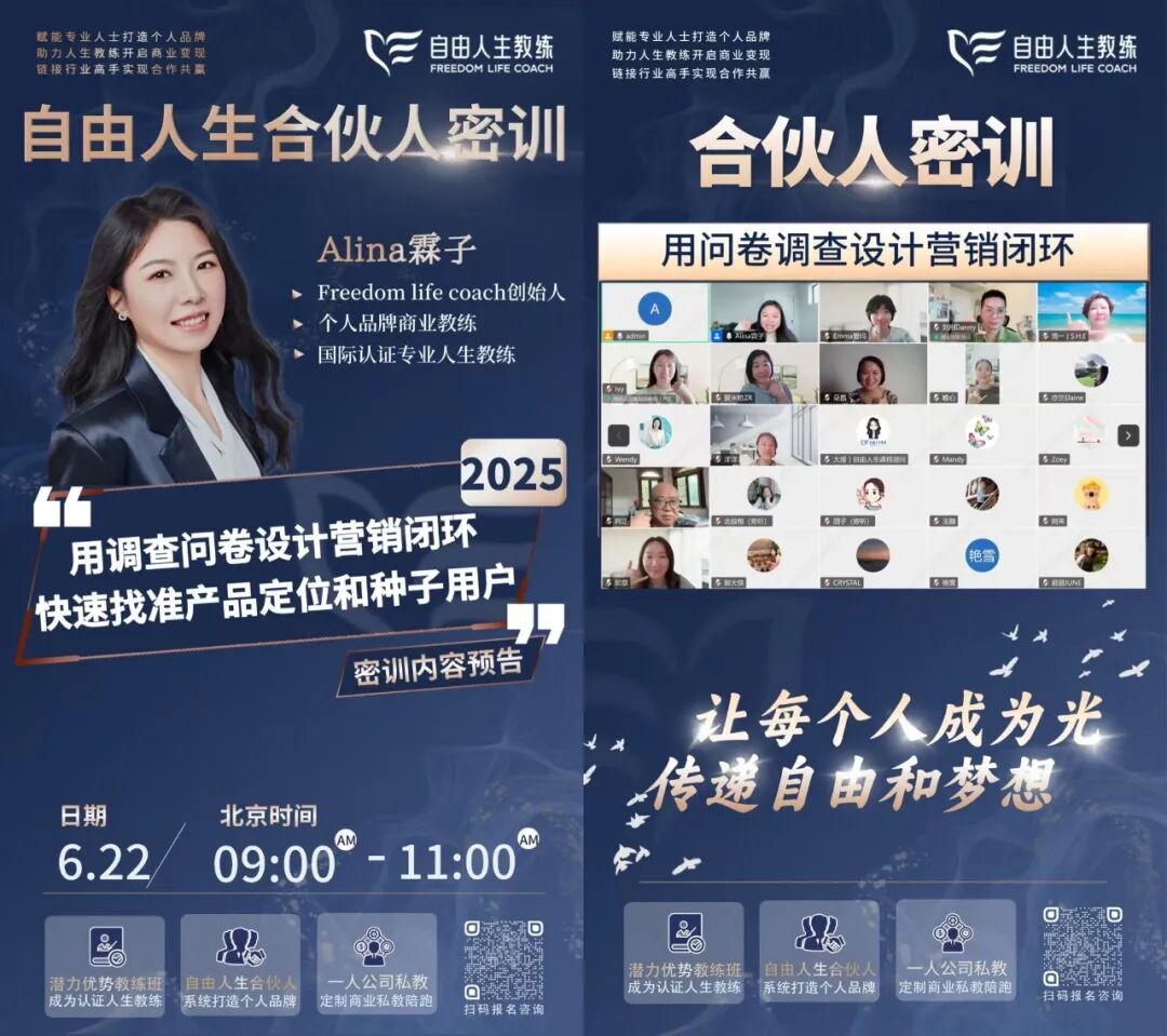 很多人前期做得很努力,却没有结果,是因为还没有闭环思维。而真正实现从“内容”到“转化”的跃迁,一定是当你开始理解并跑通:当你把这些答清楚了,系统搭好了,成长的加速度就会悄然启动。【自由人生合伙人】的成长路径就是帮助大家解答这些问题,欢迎扫码进行了解:Alina霖子第二本新书《一人公司》一经上市,便迅速引发热烈反响。她开启新书发布直播,仅用3小时便售出300+本。所有当天在直播间下单的读者,还免费获得了价值99元的《一人公司》读书会参与资格。并且很快新书也登上当当网新书热卖榜第一,同时带动她的第一本书《个人品牌打造》同步加印。为了帮助读者更好地理解和落地“一人公司”的核心方法,Alina霖子连续7天,每天早上亲自带读书会,深度拆解书中关于个人品牌与商业闭环的实战精华。原定每天1小时的分享,因为干货实在太多,常常延长至2-3小时。每一次的讲解都基于她亲身验证过的实践路径,内容扎实、案例真实、信息密度极高,许多学员在听完后还反复回放复习。现在依然可以下单读书会获取回放权限,欢迎感兴趣的小伙伴前来咨询。也正是因为这场读书会的高价值输出,吸引了18+位新合伙人抢先加入【自由人生合伙人】计划,锁定了最后一批29800元优惠名额。而仍在观望的人,如今若想加入,只能选择已恢复为39800元的新价格段。最终,这场为期7天的高密度读书会不仅帮助大量个人品牌创业者完成了认知升级,更以100万元销售额的成绩,交出了一份亮眼答卷!这是一次知识产品和社群运营完美结合的实战案例,也是【自由人生教练】用内容打造“低成本、高信任”营销闭环的鲜活样本。因此在6月,我们迎来了大量来自不同领域的高质量新合伙人,他们有的是互联网、教育、财会、医疗等领域的专家,有的是AI、管理、艺术、身心灵方向的探索者。他们都有一个共通点:在原有专业基础上,渴望将知识沉淀为影响力,将影响力转化为可持续的事业。平台也持续通过其他非常高质量的、可实操的经验分享为合伙人赋能:【7天公众号打卡营】落地,带领合伙人们通过实战将将如何从0开始运营公众号的知识内化;Alina霖子通过【自由人生合伙人密训】把自己的一人公司冷启动秘籍《用调查问卷设计营销闭环,快速找准产品定位和种子用户》的知识拆开揉碎了教给了自由人生合伙人们,帮助大家通过用户调查快速了解身边的市场需求。【自由人生潜力优势教练班】