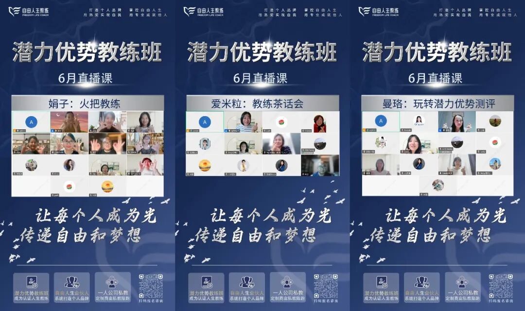 如果你渴望成为一名专业的人生教练,【自由人生潜力优势教练班】无疑是最佳选择。平台将会为你提供基于独创测评系统《潜力优势测评》的全方位教练技术培训,帮助你掌握从教练咨询到市场推广的各项核心技能。6月,我们的4位督导教练带来了精彩的4次直播学习课,带领学员深入实战,稳扎稳打提升教练技术与表达力: - 曼珞教练 主讲《潜力优势测评&商业化分享》,帮助学员理解如何将测评工具真正应用于商业实践中;